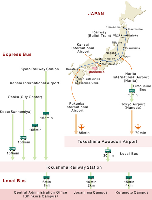도쿠시마 대학의 특징은 의치약(의학, 치의학, 약학) · 공학 · 생물 자원에 관한 교육 연구를 담당하고 이공계 중심의 교원, 더욱이 종합 과학관련 교양학부도 갖추어져 있는 종합대학입니다. 본교의 강점을 살려, 「인류의 문제를 지역으로부터 해결하는 대학」으로서 10년후에는 세계 최고 수준에 들어가는 대학이 되는 것을 목표로 하고 있습니다.